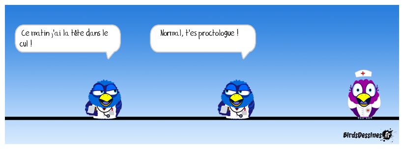 Case 1:Bird 1: Ce matin j'ai la tête dans le cul ! | Case 2: Bird 1: Normal, t'es proctologue ! | Case 3: