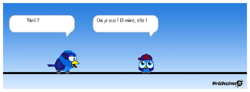 Case 1:Bird 1: Péril ? | Case 2: Bird 1: Oui je sais ! Et mère, elle ! | Case 3: