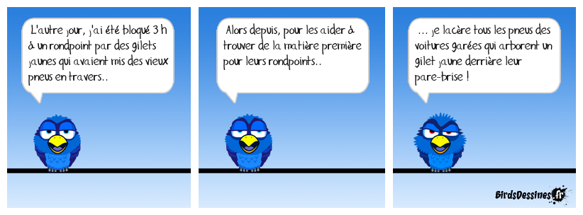 Case 1:Bird 1: L'autre jour, j'ai été bloqué 3 h à un rondpoint par des gilets jaunes qui avaient mis des vieux pneus en travers.. | Case 2: Bird 1: Alors depuis, pour les aider à trouver de la matière première pour leurs rondpoints.. | Case 3: Bird 1: ... je lacère tous les pneus des voitures garées qui arborent un gilet jaune derrière leur pare-brise !