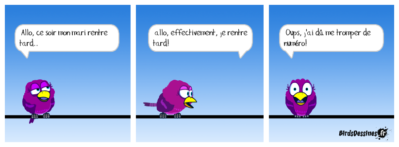 Case 1:Bird 1: Allo, ce soir mon mari rentre tard.. | Case 2: Bird 1: allo, effectivement, je rentre tard! | Case 3: Bird 1: Oups, j'ai dû me tromper de numéro!