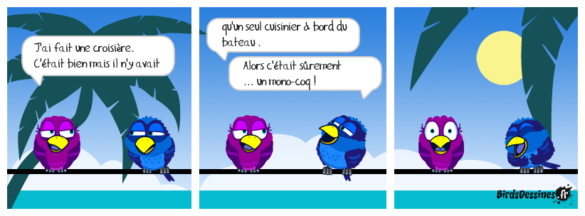 Case 1:Bird 1: J'ai fait une croisière. C'était bien mais il n'y avait | Case 2: Bird 1: qu'un seul cuisinier à bord du bateau . Bird 2: Alors c'était sûrement ... un mono-coq ! | Case 3: