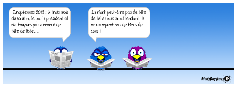 Case 1:Bird 1: Européennes 2019 : à trois mois du scrutin, le parti présidentiel n'a toujours pas annoncé de tête de liste.... | Case 2: Bird 1: Ils n'ont peut-être pas de tête de liste mais en attendant ils ne manquent pas de têtes de cons ! | Case 3: