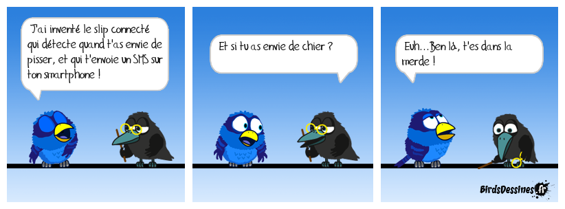 Case 1:Bird 1: J'ai inventé le slip connecté qui détecte quand t'as envie de pisser, et qui t'envoie un SMS sur ton smartphone ! | Case 2: Bird 1: Et si tu as envie de chier ? | Case 3: Bird 1: Euh...Ben là, t'es dans la merde !