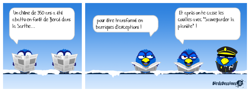 Case 1:Bird 1: Un chêne de 350 ans a été abattu en forêt de Bercé dans la Sarthe... | Case 2: Bird 1: pour être transformé en barriques d'exceptions ! Bird 2: Et après on te casse les couilles avec "Sauvegarder la planète" ! | Case 3: Bird 1: Et après on te casse les couilles avec "Sauvegarder la planète" !