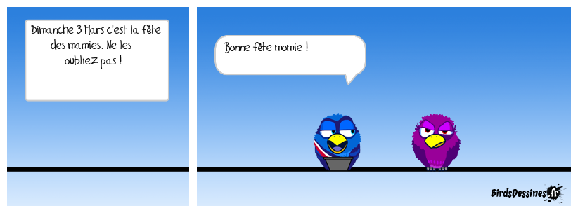 Case 1:Bird 1: Dimanche 3 Mars c'est la fête des mamies. Ne les oubliez pas ! | Case 2: Bird 1: Bonne fête momie ! | Case 3: