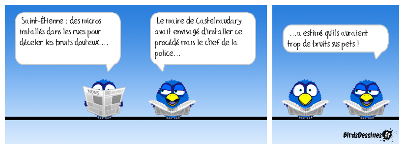 Case 1:Bird 1: Saint-Ètienne : des micros installés dans les rues pour déceler les bruits douteux.... | Case 2: Bird 1: Le maire de Castelnaudary avait envisagé d'installer ce procédé mais le chef de la police... | Case 3: Bird 1: ...a estimé qu'ils auraient trop de bruits sus pets !