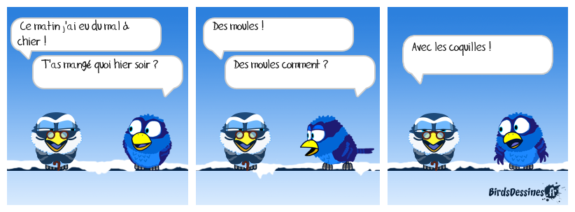 Case 1:Bird 1: Ce matin j'ai eu du mal à chier !Bird 2: T'as mangé quoi hier soir ? | Case 2: Bird 1: Des moules ! Bird 2: Des moules comment ? | Case 3: Bird 1: Avec les coquilles !