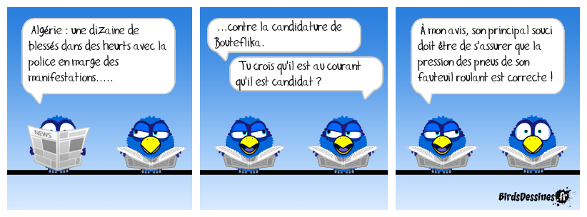 Case 1:Bird 1: Algérie : une dizaine de blessés dans des heurts avec la police en marge des manifestations..... | Case 2: Bird 1: ...contre la candidature de Bouteflika. Bird 2: Tu crois qu'il est au courant qu'il est candidat ? | Case 3: Bird 1: À mon avis, son principal souci doit être de s'assurer que la pression des pneus de son fauteuil roulant est correcte !