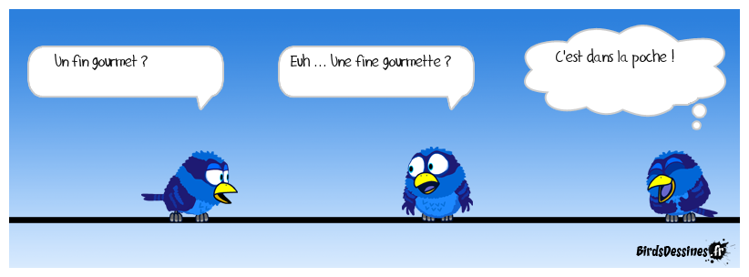 Case 1:Bird 1: Un fin gourmet ? | Case 2: Bird 1: Euh ... Une fine gourmette ? | Case 3: Bird 1: C'est dans la poche !