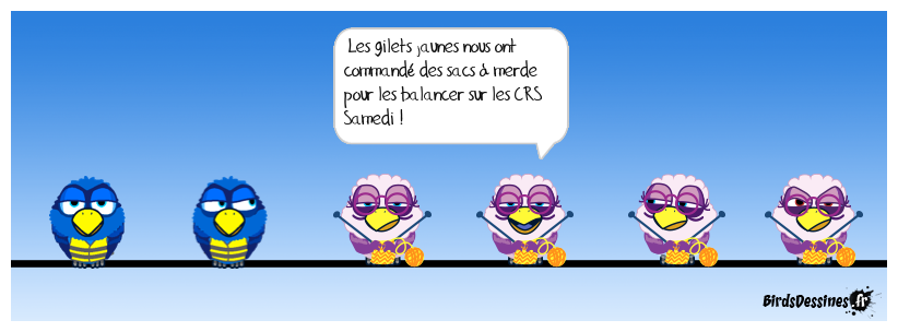 Case 1: | Case 2: Bird 1: Les gilets jaunes nous ont commandé des sacs à merde pour les balancer sur les CRS Samedi ! | Case 3:
