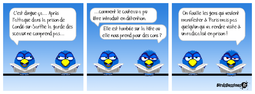 Case 1:Bird 1: C'est dingue ça... Après l'attaque dans la prison de Condé-sur-Sarthe la garde des sceaux ne comprend pas... | Case 2: Bird 1: ...comment le couteau a pu être introduit en détention. Bird 2: Elle est tombée sur la tête ou elle nous prend pour des cons ? | Case 3: Bird 1: On fouille les gens qui veulent manifester à Paris mais pas quelqu'un qui va rendre visite à un radicalisé en prison !