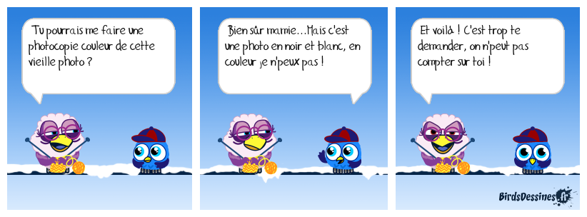 Case 1:Bird 1: Tu pourrais me faire une photocopie couleur de cette vieille photo ? | Case 2: Bird 1: Bien sûr mamie...Mais c'est une photo en noir et blanc, en couleur je n'peux pas ! | Case 3: Bird 1: Et voilà ! C'est trop te demander, on n'peut pas compter sur toi !