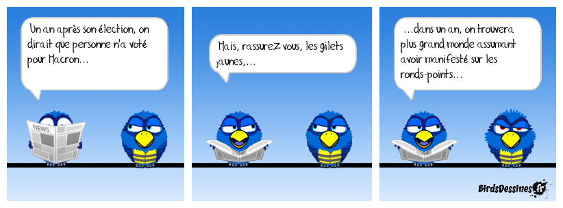Case 1:Bird 1: Un an après son élection, on dirait que personne n'a voté pour Macron... | Case 2: Bird 1: Mais, rassurez vous, les gilets jaunes,... | Case 3: Bird 1: ...dans un an, on trouvera plus grand monde assumant avoir manifesté sur les ronds-points...