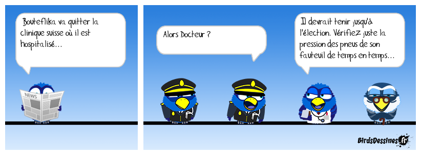 Case 1:Bird 1: Bouteflika va quitter la clinique suisse où il est hospitalisé... | Case 2: Bird 1: Alors Docteur ? | Case 3: Bird 1: Il devrait tenir jusqu'à l'élection. Vérifiez juste la pression des pneus de son fauteuil de temps en temps...