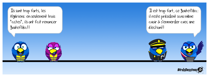 Case 1:Bird 1: Ils sont trop forts, les Algériens: en seulement trois "actes", ils ont fait renoncer Bouteflika!! | Case 2: Bird 1: Il est trop fort, ce Bouteflika: il reste président sans même avoir à s'emmerder avec une élection!! | Case 3: Bird 1: Il est trop fort, ce Bouteflika: il reste président sans même avoir à s'emmerder avec une élection!!
