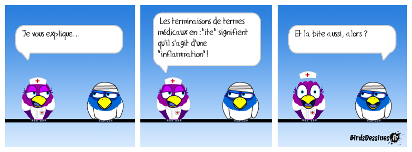 Case 1:Bird 1: Je vous explique... | Case 2: Bird 1: Les terminaisons de termes médicaux en :"ite" signifient qu'il s'agit d'une "inflammation"! | Case 3: Bird 1: Et la bite aussi, alors ?