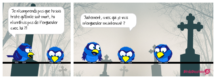 Case 1:Bird 1: Je n'comprends pas que tu sois triste qu'Emile soit mort, tu n'arrêtais pas de t'engueuler avec lui ?! | Case 2: Bird 1: Justement, avec qui je vais m'engueuler maintenant ? | Case 3: