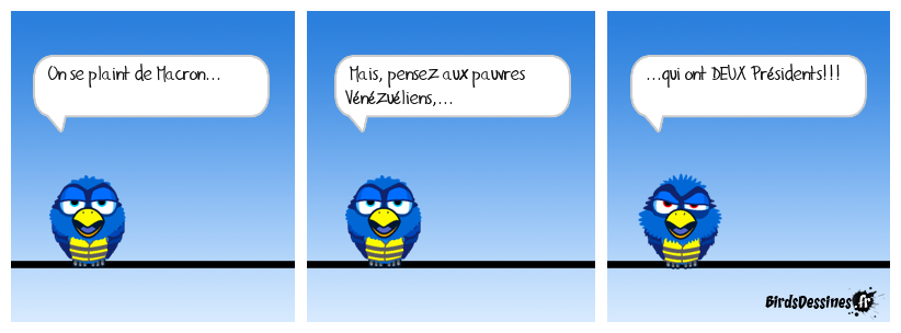 Case 1:Bird 1: On se plaint de Macron... | Case 2: Bird 1: Mais, pensez aux pauvres Vénézuéliens,... | Case 3: Bird 1: ...qui ont DEUX Présidents!!!