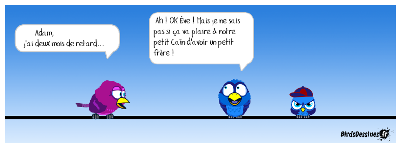 Case 1:Bird 1: Adam, j'ai deux mois de retard... | Case 2: Bird 1: Ah ! OK Éve ! Mais je ne sais pas si ça va plaire à notre petit Caîn d'avoir un petit frère ! | Case 3: