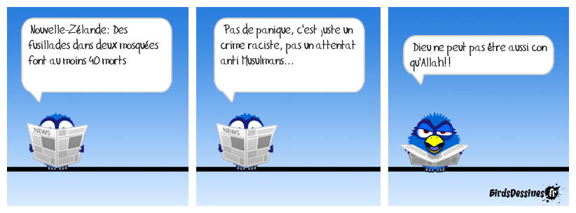 Case 1:Bird 1: Nouvelle-Zélande: Des fusillades dans deux mosquées font au moins 40 morts | Case 2: Bird 1: Pas de panique, c'est juste un crime raciste, pas un attentat anti Musulmans... | Case 3: Bird 1: Dieu ne peut pas être aussi con qu'Allah!!
