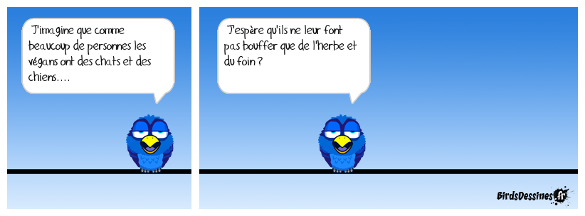 Case 1:Bird 1: J'imagine que comme beaucoup de personnes les végans ont des chats et des chiens.... | Case 2: Bird 1: J'espère qu'ils ne leur font pas bouffer que de l'herbe et du foin ? | Case 3: