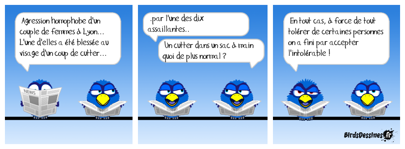 Case 1:Bird 1: Agression homophobe d'un couple de femmes à Lyon... L'une d'elles a été blessée au visage d'un coup de cutter... | Case 2: Bird 1: .par l'une des dix assaillantes.. Bird 2: Un cutter dans un sac à main quoi de plus normal ? | Case 3: Bird 1: En tout cas, à force de tout tolérer de certaines personnes on a fini par accepter l'intolérable !