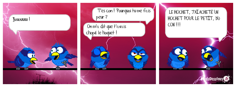 Case 1:Bird 1: Bououuuu ! Bird 2: T'es con ! Pourquoi tu me fais peur ? | Case 2: Bird 1: T'es con ! Pourquoi tu me fais peur ? Bird 2: On m'a dit que t'avais chopé le hoquet ! | Case 3: Bird 1: LE HOCHET, J'AI ACHETÉ UN HOCHET POUR LE PETIT, DU CON !!!