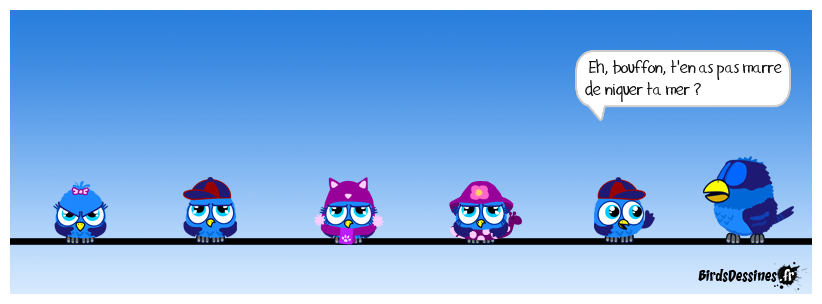 Case 1: | Case 2: | Case 3: Bird 1: Eh, bouffon, t'en as pas marre de niquer ta mer ?