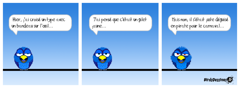 Case 1:Bird 1: Hier, j'ai croisé un type avec un bandeau sur l’œil... | Case 2: Bird 1: J'ai pensé que c'était un gilet jaune... | Case 3: Bird 1: Mais non, il s'était juste déguisé en pirate pour le carnaval...