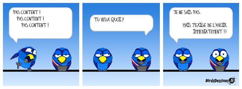 Case 1:Bird 1: PAS CONTENT ! PAS CONTENT ! PAS CONTENT ! | Case 2: Bird 1: TU VEUX QUOI ? | Case 3: Bird 1: JE NE SAIS PAS. MAIS J'EXIGE DE L'AVOIR IMMEDIATEMENT !!