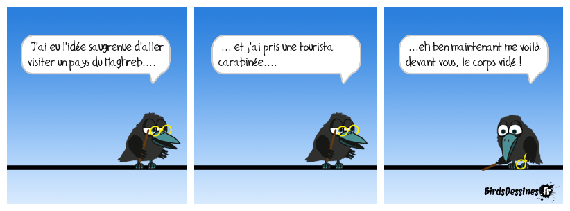 Case 1:Bird 1: J'ai eu l'idée saugrenue d'aller visiter un pays du Maghreb.... | Case 2: Bird 1: ... et j'ai pris une tourista carabinée.... | Case 3: Bird 1: ...eh ben maintenant me voilà devant vous, le corps vidé !