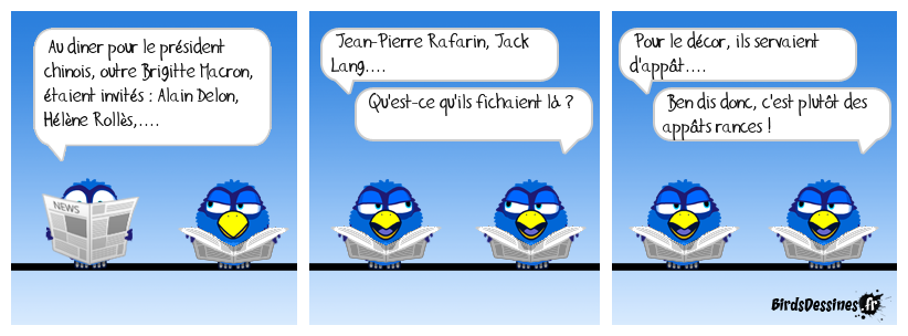 Case 1:Bird 1: Au diner pour le président chinois, outre Brigitte Macron, étaient invités : Alain Delon, Hélène Rollès,.... | Case 2: Bird 1: Jean-Pierre Rafarin, Jack Lang.... Bird 2: Qu'est-ce qu'ils fichaient là ? | Case 3: Bird 1: Pour le décor, ils servaient d'appât.... Bird 2: Ben dis donc, c'est plutôt des appâts rances !