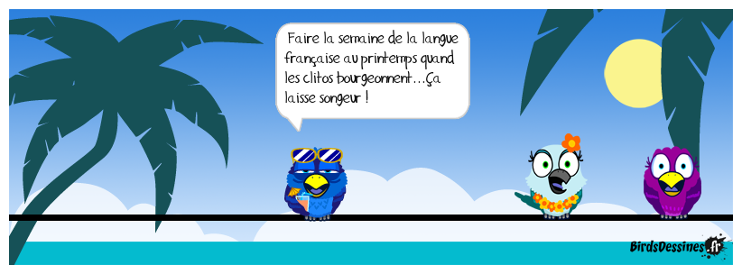 Case 1: | Case 2: Bird 1: Faire la semaine de la langue française au printemps quand les clitos bourgeonnent...Ça laisse songeur ! | Case 3: