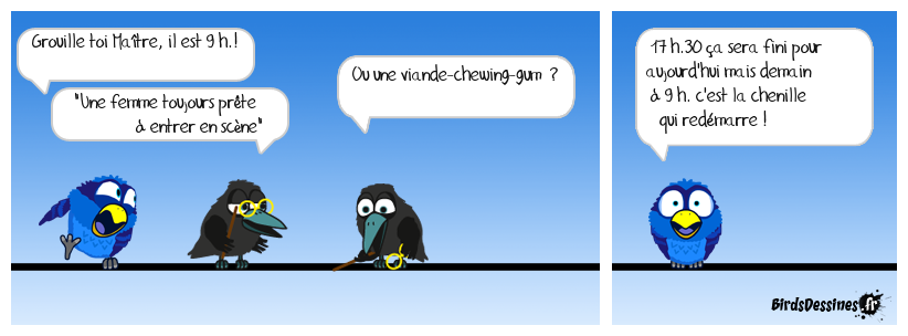 Case 1:Bird 1: Grouille toi Maïtre, il est 9 h.!Bird 2: "Une femme toujours prête à entrer en scène" | Case 2: Bird 1: Ou une viande-chewing-gum ? | Case 3: Bird 1: 17 h.30 ça sera fini pour aujourd'hui mais demain à 9 h. c'est la chenille qui redémarre !