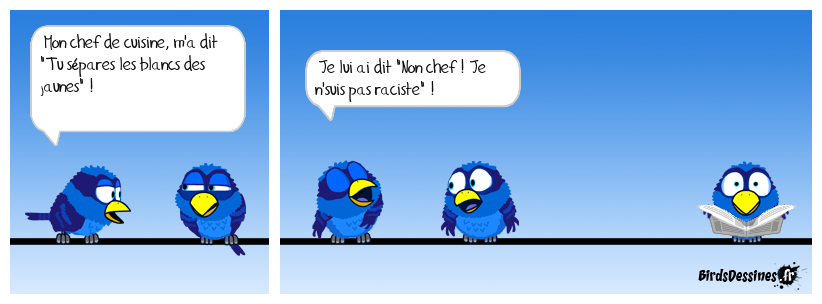 Case 1:Bird 1: Mon chef de cuisine, m'a dit "Tu sépares les blancs des jaunes" ! | Case 2: Bird 1: Je lui ai dit "Non chef ! Je n'suis pas raciste" ! | Case 3: