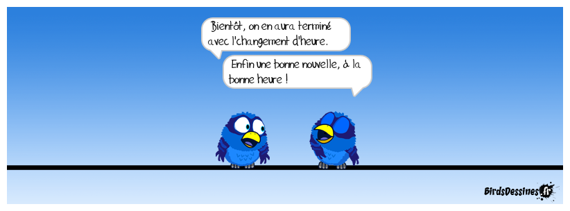 Case 1: | Case 2: Bird 1: Bientôt, on en aura terminé avec l'changement d'heure. Bird 2: Enfin une bonne nouvelle, à la bonne heure ! | Case 3: