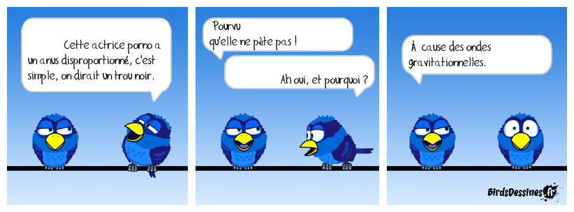 Case 1:Bird 1: Cette actrice porno a un anus disproportionné, c'est simple, on dirait un trou noir. Bird 2: Ah vraiment !!! | Case 2: Bird 1: Pourvu qu'elle ne pète pas ! Bird 2: Ah oui, et pourquoi ? | Case 3: Bird 1: À cause des ondes gravitationnelles.