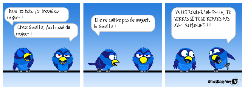 Case 1:Bird 1: Dans les bois, j'ai trouvé du muguet !Bird 2: Chez Ginette, j'ai trouvé du muguet ! | Case 2: Bird 1: Elle ne cultive pas de muguet, la Ginette ! | Case 3: Bird 1: VA LUI ROULER UNE PELLE, TU VERRAS SI TU NE REPARS PAS AVEC DU MUGUET !!!