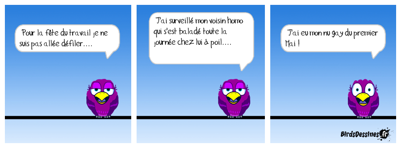 Case 1:Bird 1: Pour la fête du travail je ne suis pas allée défiler.... | Case 2: Bird 1: J'ai surveillé mon voisin homo qui s'est baladé toute la journée chez lui à poil.... | Case 3: Bird 1: J'ai eu mon nu gay du premier Mai !