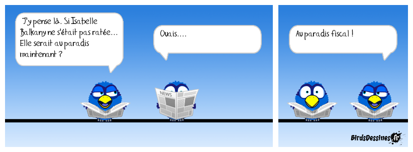 Case 1:Bird 1: J'y pense là. Si Isabelle Balkany ne s'était pas ratée... Elle serait au paradis maintenant ? | Case 2: Bird 1: Ouais.... | Case 3: Bird 1: Au paradis fiscal !