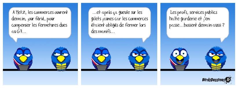Case 1:Bird 1: A Metz, les commerces ouvrent demain, jour férié, pour compenser les fermetures dues au G7... | Case 2: Bird 1: ...et après ça gueule sur les gilets jaunes car les commerces étaient obligés de fermer lors des manifs... | Case 3: Bird 1: Les profs, services publics halte garderie et j'en passe...bossent demain aussi ?
