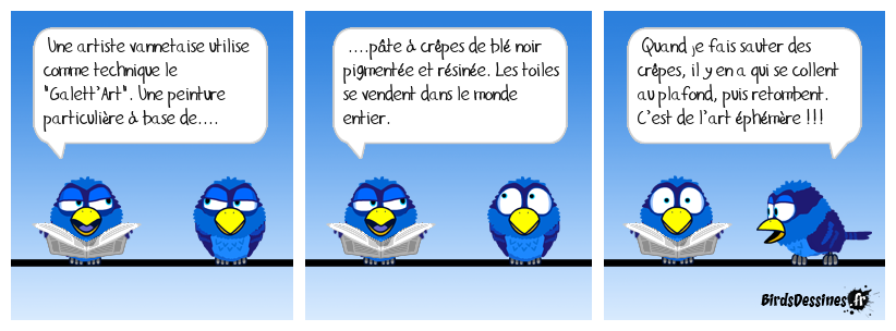 Case 1:Bird 1: Une artiste vannetaise utilise comme technique le "Galett’Art". Une peinture particulière à base de.... | Case 2: Bird 1: ....pâte à crêpes de blé noir pigmentée et résinée. Les toiles se vendent dans le monde entier. | Case 3: Bird 1: Quand je fais sauter des crêpes, il y en a qui se collent au plafond, puis retombent. C’est de l’art éphémère !!!