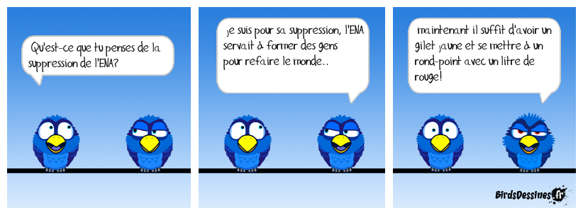 Case 1:Bird 1: Qu'est-ce que tu penses de la suppression de l'ENA? | Case 2: Bird 1: je suis pour sa suppression, l'ENA servait à former des gens pour refaire le monde.. | Case 3: Bird 1: maintenant il suffit d'avoir un gilet jaune et se mettre à un rond-point avec un litre de rouge!