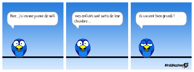 Case 1:Bird 1: Hier, j'ai eu une panne de wifi | Case 2: Bird 1: mes enfants sont sortis de leur chambre... | Case 3: Bird 1: ils avaient bien grandi !