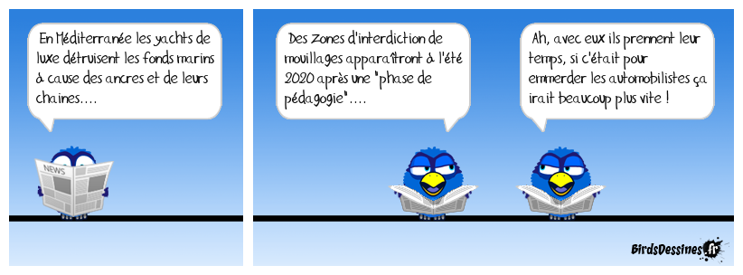 Case 1:Bird 1: En Méditerranée les yachts de luxe détruisent les fonds marins à cause des ancres et de leurs chaines.... | Case 2: Bird 1: Des zones d'interdiction de mouillages apparaïtront à l'été 2020 après une "phase de pédagogie".... | Case 3: Bird 1: Ah, avec eux ils prennent leur temps, si c'était pour emmerder les automobilistes ça irait beaucoup plus vite !
