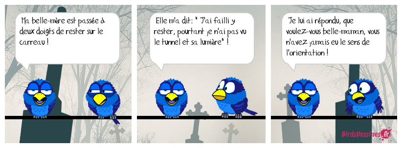 Case 1:Bird 1: Ma belle-mère est passée à deux doigts de rester sur le carreau ! | Case 2: Bird 1: Elle m'a dit: " J'ai failli y rester, pourtant je n'ai pas vu le tunnel et sa lumière" ! | Case 3: Bird 1: Je lui ai répondu, que voulez-vous belle-maman, vous n'avez jamais eu le sens de l'orientation !