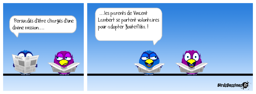 Case 1:Bird 1: Persuadés d'être chargés d'une divine mission.... | Case 2: Bird 1: ...les parents de Vincent Lambert se portent volontaires pour adopter Bouteflika ! | Case 3: