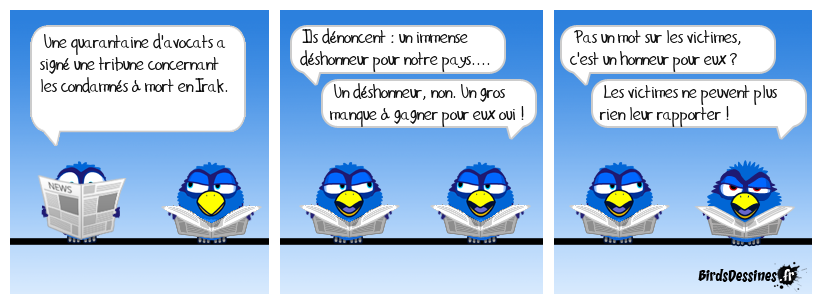 Case 1:Bird 1: Une quarantaine d'avocats a signé une tribune concernant les condamnés à mort en Irak. | Case 2: Bird 1: Ils dénoncent : un immense déshonneur pour notre pays.... Bird 2: Un déshonneur, non. Un gros manque à gagner pour eux oui ! | Case 3: Bird 1: Pas un mot sur les victimes, c'est un honneur pour eux ? Bird 2: Les victimes ne peuvent plus rien leur rapporter !
