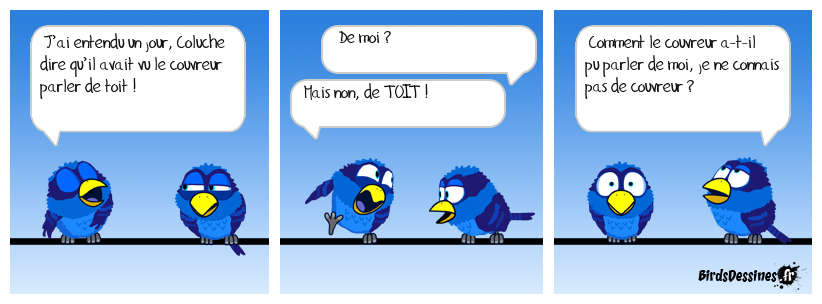 Case 1:Bird 1: J’ai entendu un jour, Coluche dire qu’il avait vu le couvreur parler de toit ! | Case 2: Bird 1: De moi ? Bird 2: Mais non, de TOIT ! | Case 3: Bird 1: Comment le couvreur a-t-il pu parler de moi, je ne connais pas de couvreur ?