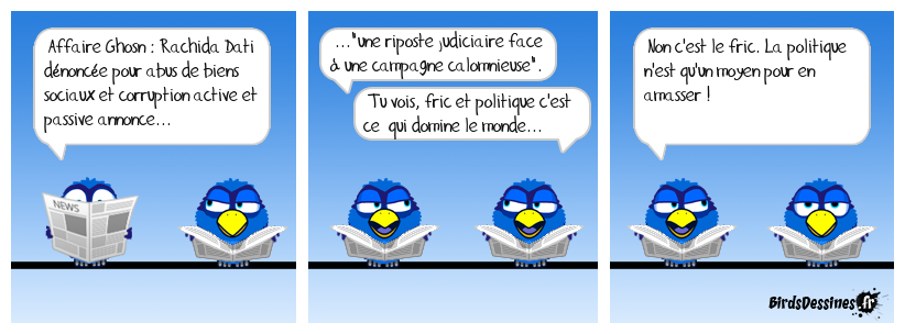 Case 1:Bird 1: Affaire Ghosn : Rachida Dati dénoncée pour abus de biens sociaux et corruption active et passive annonce... | Case 2: Bird 1: ..."une riposte judiciaire face à une campagne calomnieuse". Bird 2: Tu vois, fric et politique c'est ce qui domine le monde... | Case 3: Bird 1: Non c'est le fric. La politique n'est qu'un moyen pour en amasser !